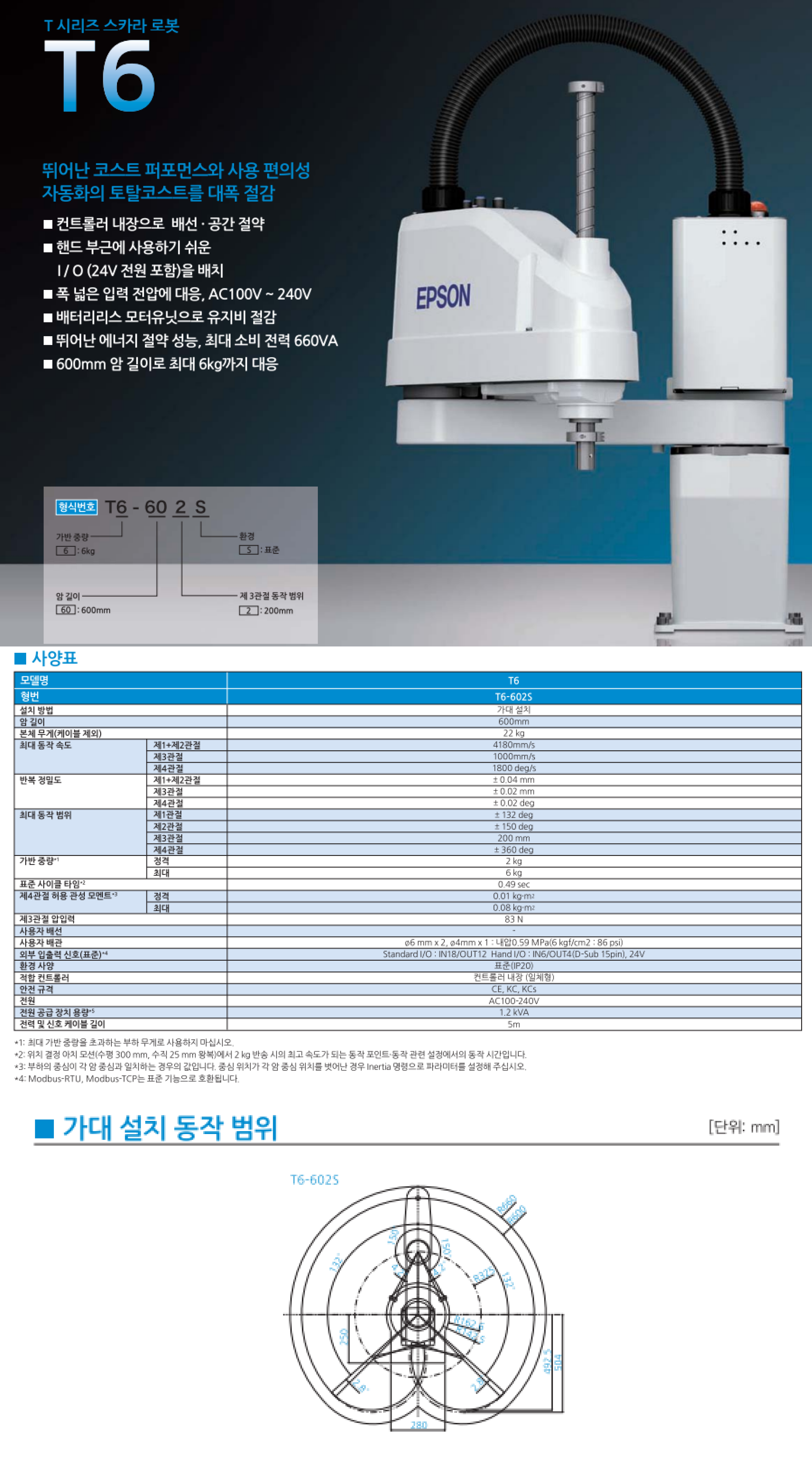 | 상품명(모델명) | EPSON T6B SCARA Robots (Payload : 6 kg, Reach : 600 mm) | ||