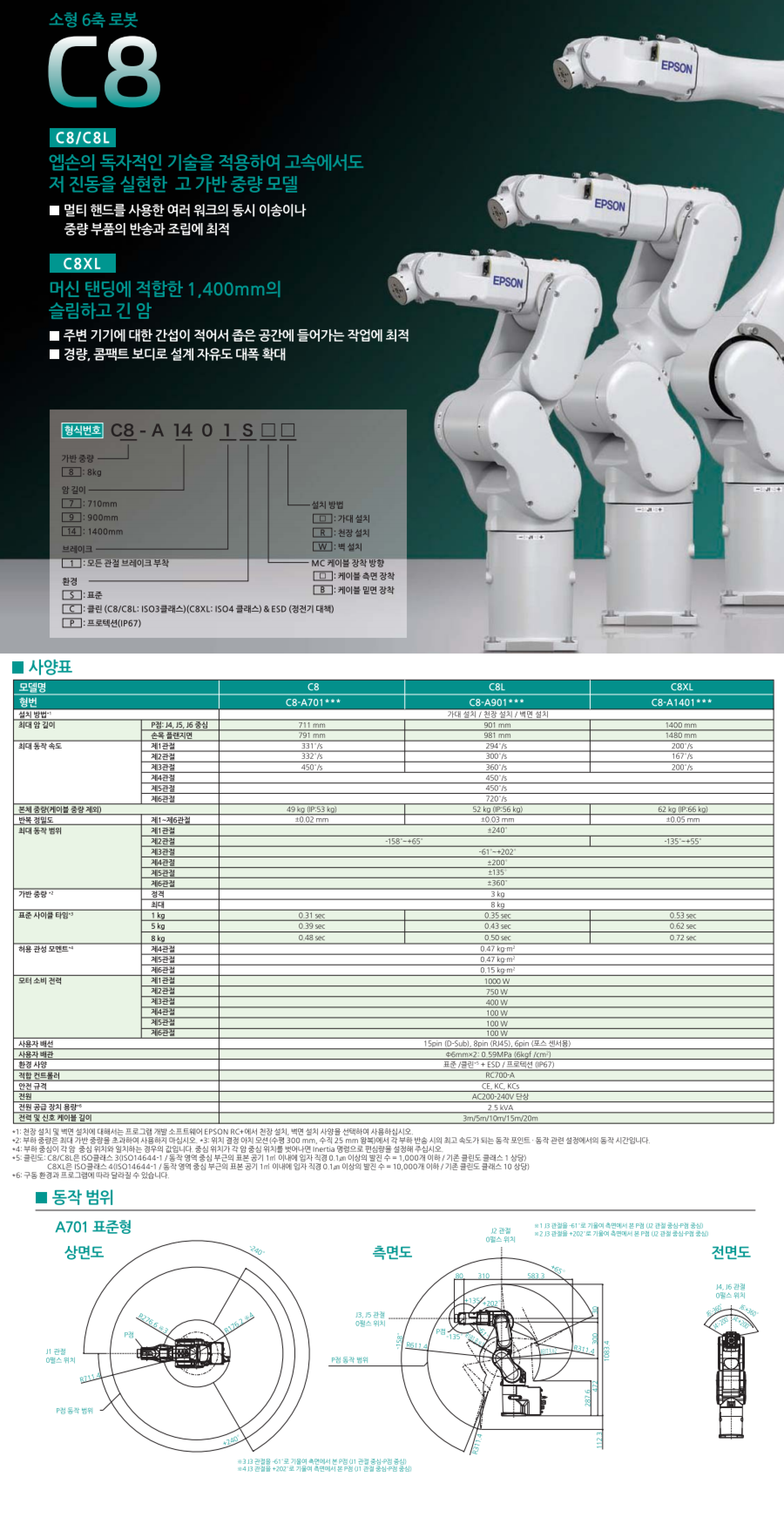 | 상품명(모델명) | EPSON C8 6축 Robots (Payload : 8 kg, Reach : 791 mm) | ||