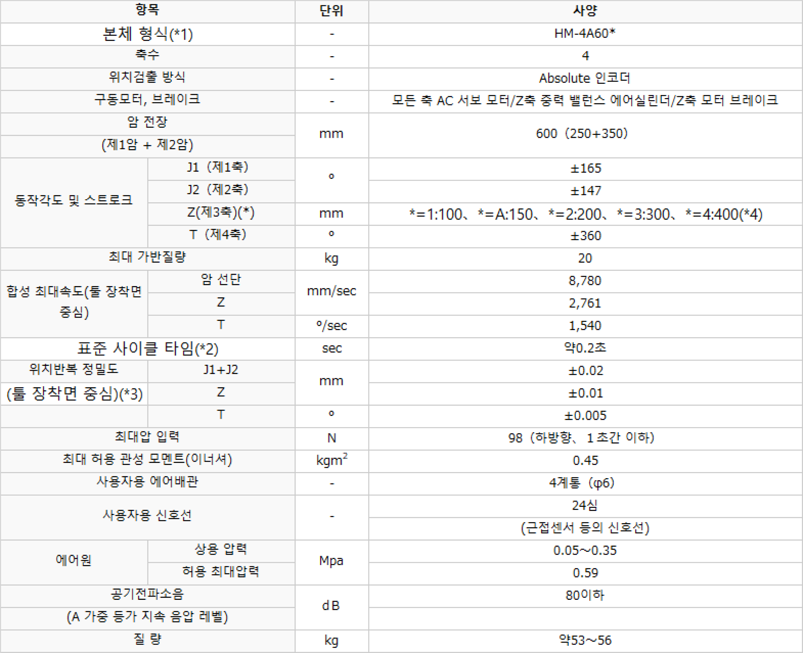 | 상세스펙 | 반복정밀도 : ±0.02mm | ||