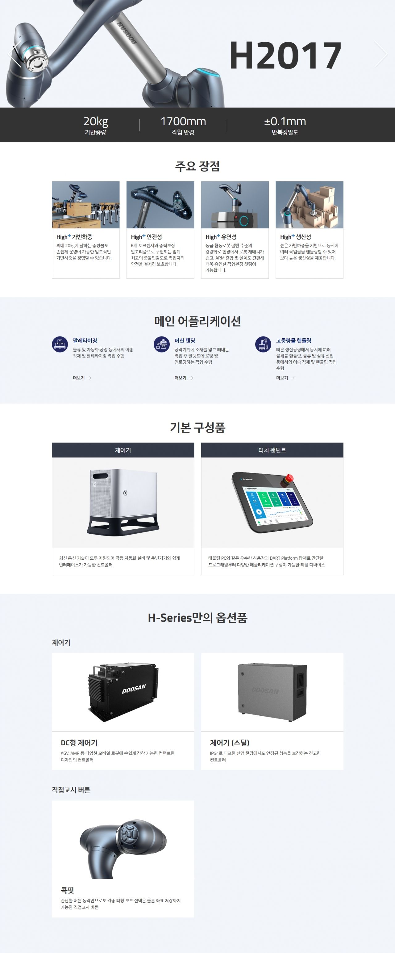 | 상품명(모델명) | [업계 최저가] 두산로보틱스 H2017 (Payload : 20kg, Reach : 1700mm) | ||