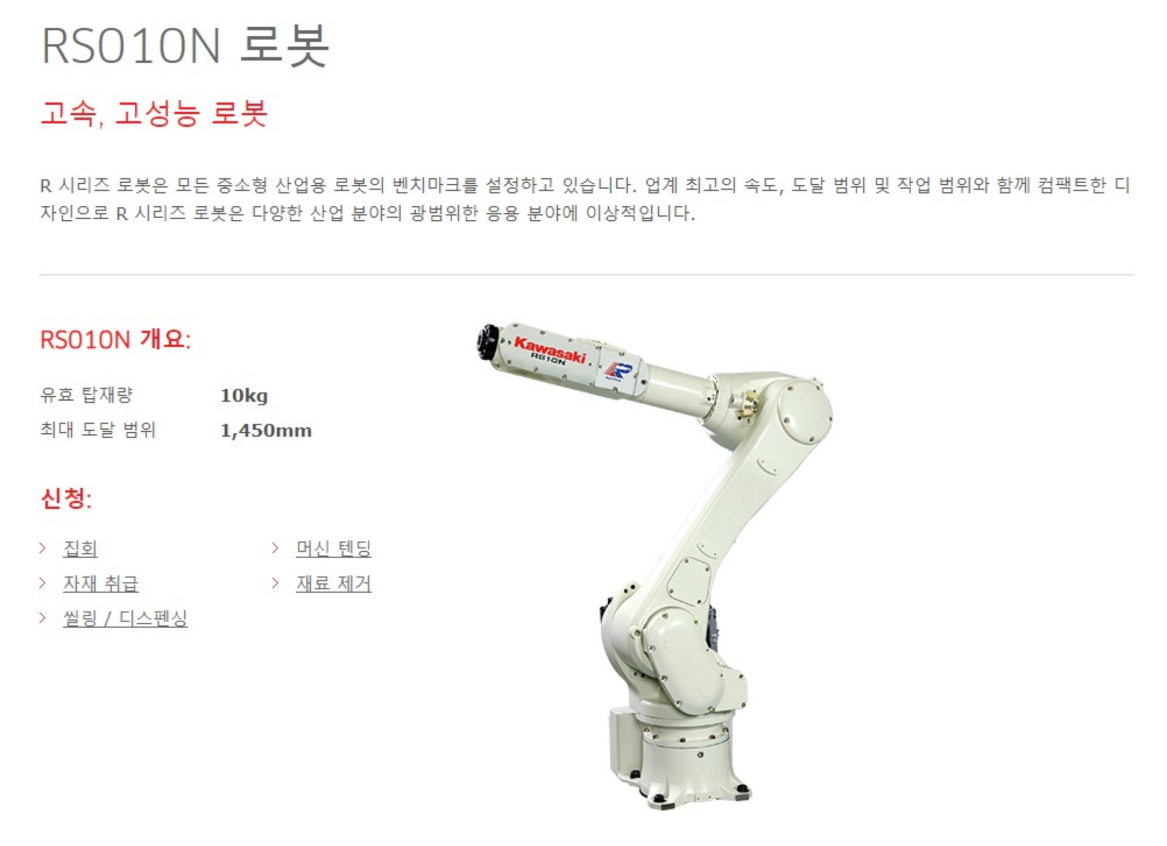 | 상품명(모델명) | Kawasaki 중소형 범용 로봇 RS010N (Payload : 10 kg , Reach: 1,450 mm) | ||