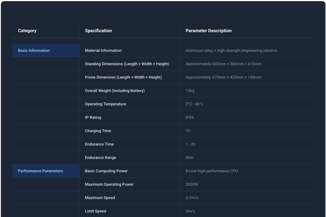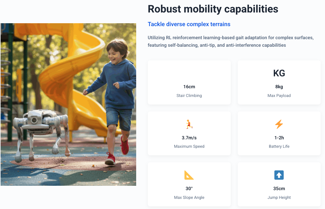 최대 적재하중 8kg, 최고 속도 3.7m/s, 최대 등판각 30°